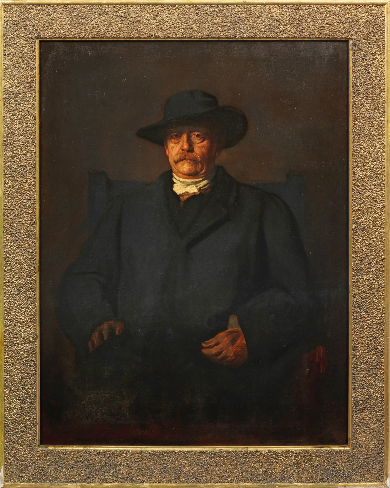 Lebensgroßes, halbfiguriges Porträt des en face in einem Lehnstuhl sitzenden Staatsmannes als Privatmann in dunklem Gehrock und Hut, das die durchaus nachdenkliche Persönlichkeit Bismarcks ausdrucksvoll charakterisiert. Lenbach schuf um 1879-1897 über 80 Bismarck-Bildnisse, ein vergleichbares Porträt von 1884 befindet sich in der Neuen Pinakothek in München. Lenbach Porträts des Staatsmannes prägen bis in die heutige Zeit das öffentliche Bild Bismarcks und dessen Nachruhm. Meist sind sie auf das imposante Gesicht Bismarcks konzentriert, das durch effektvolle Lichtführung aus dem Dunkel hervortritt; seit den 1880er Jahren schilderte Lenbach den Reichskanzler vornehmlich in Zivilkleidung. Öl/Lwd.; 123 cm x 96 cm. Original-Rahmen.