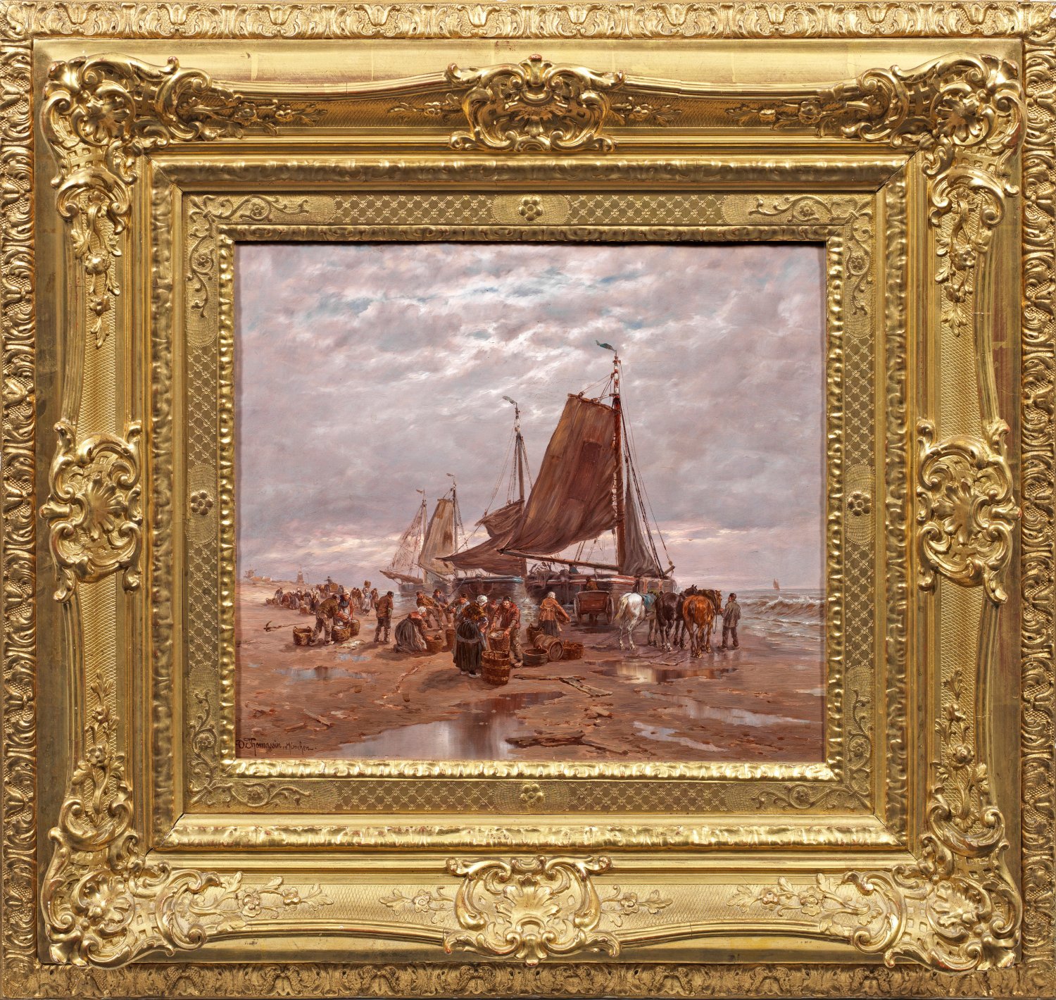 In den vielen Figuren feinmalerisch ausgeführtes, stimmungsvolles und lebendig geschildertes Werk des Münchener Malers, welcher der Dachauer Künstlerkolonie nahestand. Sein vielseitiges, künstlerisch qualitätvolles Oeuvre umfasst neben holländischen Motiven mit Fischern und vielfältigen Winterlandschaften vornehmlich Darstellungen aus Oberbayern und Tirol, besonders Heuernten und Dorfansichten. Öl/Mahagonitafel. L. u. sign. mit Ortsangabe München. 36 cm x 42 cm. Rahmen.