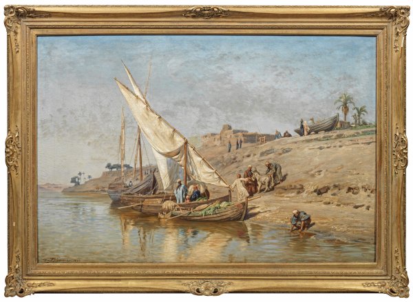 Blick auf das Nilufer mit Segelbooten und Fellachen beim Verladen eines störrischen Esels. Eindrucksvolle, sehr charakteristische Orientvedute Körners, bei der die erzählerisch sehr lebendig geschilderte Szene und die landschaftlich atmosphärisch gestimmte, detailgetreue Wiedergabe des Ortes zu einem überzeugenden Bildganzen verschmelzen. Ernst Koerner erfuhr seine künstlerische Ausbildung seit 1861 als Schüler im Atelier von Hermann Eschke in Berlin, später auch bei Carl Steffeck und Gottlieb Biermann. 1873-1905 besuchte Körner mehrfach Ägypten und den Orient, die auf diesen Reisen basierenden Veduten machten ihn schon früh berühmt. Wegen der feinen Wiedergabe von Lichtstimmungen wurde er zu den besten Koloristen der "Berliner Schule" gezählt. Seit 1864 stellte Koerner vielfach aus, erhielt eine Reihe von Medaillen in Berlin, Wien, Melbourne und Philadelphia. 1894 wurde Körner Professor an der Berliner Akademie, 1895-1899 wirkte er als Vorsitzender des Vereins Berliner Künstler. Öl/Lwd.; L. u. sign. und dat. 1896. Verso Original-Etikett der Internationalen Kunstausstellung Berlin 1896 mit Künstler-Bez. u. Betitelung "Barut am Nil". 101 cm x 151 cm. Rahmen.