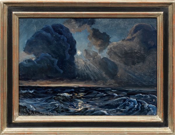 Äußerst stimmungsvolle, nächtliche Ansicht des bewegten Meeres, das von dem Schein des zwischen den dunklen Wolken durchscheinenden Mondes effektvoll inszeniert wird. Nahezu sein gesamtes Schaffen hindurch widmete sich der Künstler bevorzugt der Landschaft, deren Darstellung aus der unmittelbaren Anschauung der Natur, der sog. "Freilichtmalerei", entstand. Öl/Karton. Sign. und dat. 1902. 24 cm x 33 cm. Rahmen.