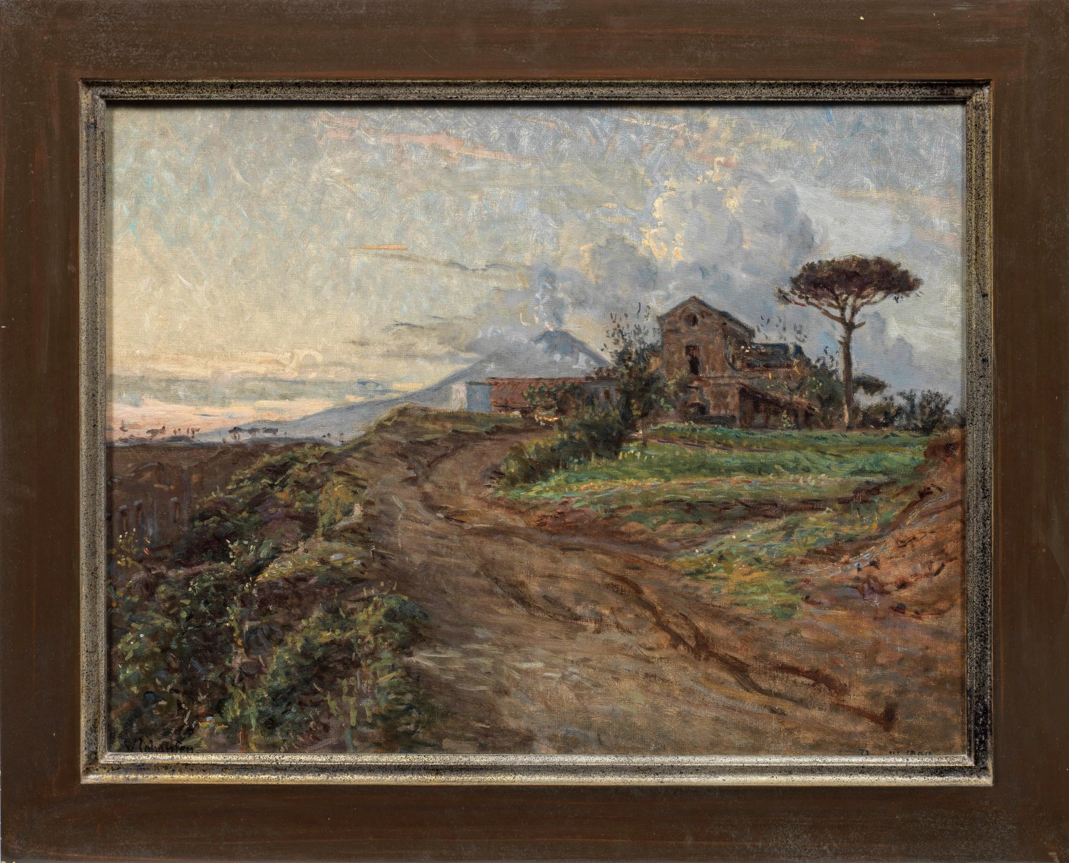 Unter stimmungsvoll, zartpastellig gefärbtem Horizont erstreckt sich die in tonigem Kolorit gemalte neapolitanische Landschaft mit einem großen Anwesen, im Hintergrund erhebt sich sanft der rauchende Vesuv. In lockerem, impressionistischem Duktus gemalte Landpartie Johansens, die am Ende seiner Italienreisen, die er in den Jahren zwischen 1898 und 1904 unternahm, entstanden sein wird. Der dänische Künstler studierte 1868-1875 an der Akademie in Kopenhagen. 1876 stellte er erstmals aus und begab sich in den 1880er Jahren auf Studienreisen durch Europa. Er beteiligte sich an internationalen, renommierten Ausstellungen u. a. in Paris, Chicago, Wien, Berlin und München, wo er vielfach prämiert wurde. Öl/Lwd., doubliert; L. u. sign.; R. u. Ortsangabe Pompeji und dat. 1904. Verso auf einem alten Ausstellungsetikett sign.; 49 cm x 64,5 cm. Rahmen.