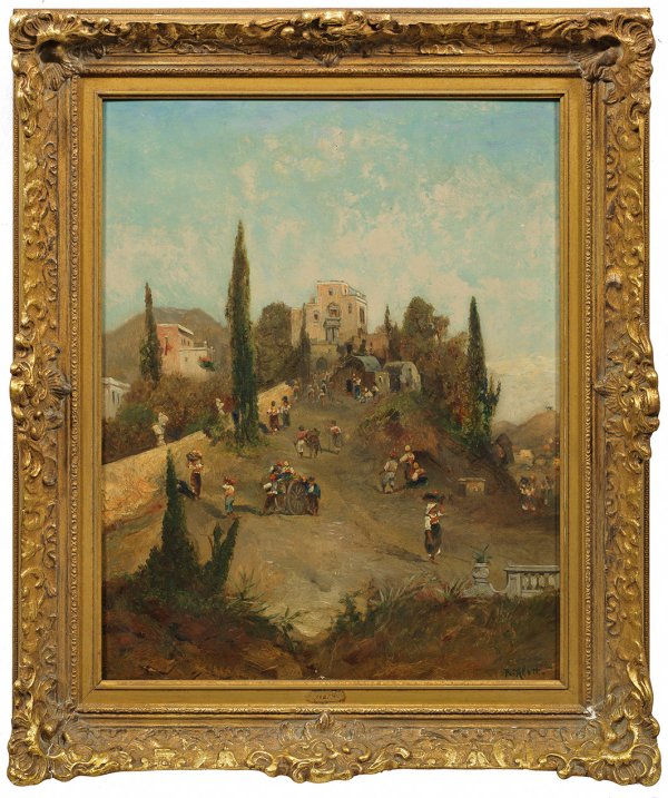 Stil- und motivtypische, mediterrane Stimmungslandschaft des bekannten, österreichischen Malers, der zahlreiche Länder der Mittelmeerküste bereiste. Alott schuf viele, durch ihr Lokalkolorit und ihre besondere Atmosphäre überzeugende Italien-Veduten, die auch den Schwerpunkt seines Oeuvres bilden. Öl/Mahagonitafel. R. u. sign.; 52,5 cm x 41,8 cm. Rahmen.