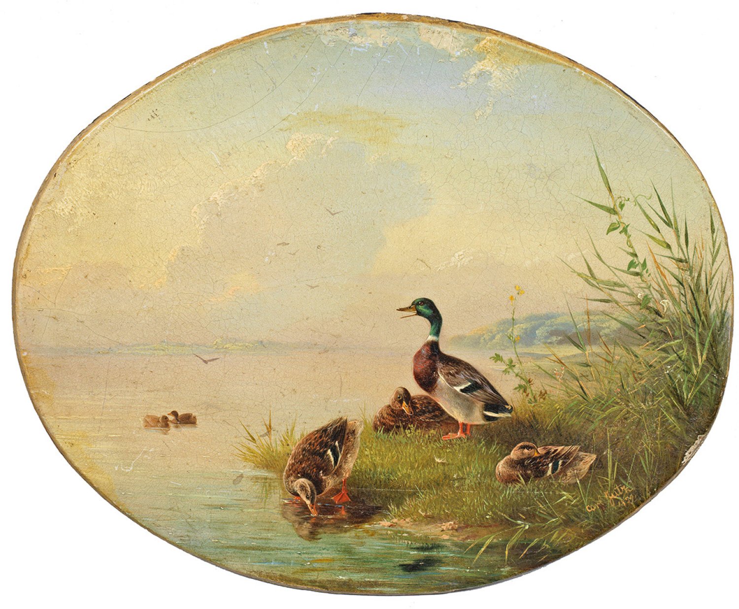 Frühes Vogelbild des Malers mit überaus detailreich und naturgetreu geschilderten Enten in atmosphärisch gestimmter Landschaft. Jutz trat 1853 in das Atelier des Tiermalers August Knip in Baden-Baden ein und ließ sich 1867 in Düsseldorf nieder, wo er intensive Vogelstudien betrieb, u. a. eigene Entenställe errichtete. Besonders seine virtuos gemalten, in ihrer Lebenstreue beeindruckenden, feinmalerischen Vogeldarstellungen machten ihn bekannt. Öl/Holztafel. R. u. sign. u. dat. 1859. 23,5 cm x 28,5 cm, im Oval.