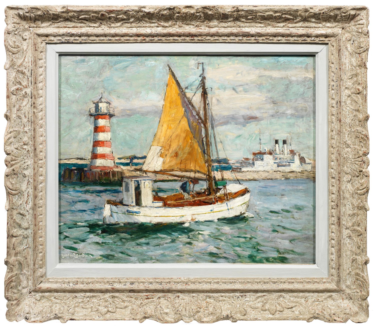 Impressionistisches, mit schnellem, breitem Duktus und weich-pastosem Farbauftrag gemaltes Werk Sandrocks aus einer Reihe von Hafendarstellungen norddeutscher Küstenstädte und Fischerorte. Der von Hermann Eschke ausgebildete und von der Haager Schule beeinflusste Künstler, widmete sich mit großer Leidenschaft der maritimen Thematik. Sandrock beschickte ab 1897 die Großen Berliner Kunstausstellungen. 1905 zeigte er dort das im Motiv vergleichbare Gemälde "Einkommender Fischkutter" (in Cuxhaven), das von der Nationalgalerie in Berlin erworben wurde (seit 1945 verschollen). 1912 rühmte Max Osborn den Künstler als "eins der stärksten und hoffnungsvollsten Talente der Berliner Malerzunft". Öl/Lwd., doubl.; L. u. sign.; Verso vom Künstler eigenhändig bez. u. betitelt mit Adresse in Berlin-Friedenau; Etiketten von Sandrock-Ausstellungen im Deutschen Schiffahrtsmuseum in Bremerhaven und in der Kunsthalle Wilhelmshaven, 1997/98. 54 cm x 67 cm. Rahmen.
