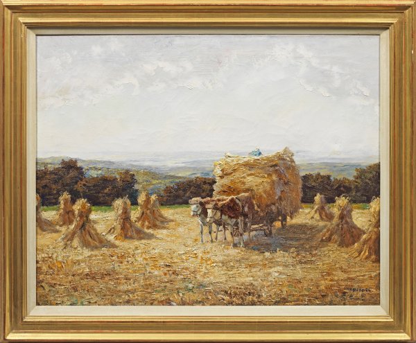 1938 oberhalb des Chiemsees (im Hintergrund) gemalte Ernteszene mit Ochsengespann und Getreidehocken, bei der Pippel virtuos das Licht eines Juli- oder Augusttages einfing. Impressionistisches, motiv- und stiltypisches Werk Pippels, der in Karlsruhe und Dresden bei Gotthardt Kuehl studierte. Der seit 1909 vornehmlich in Planegg bei München ansässige Künstler debütierte 1911 im Münchener Glaspalast, wo er seitdem regelmäßig und vielfach ausstellte. Im selben Jahr wurde er Mitglied der Künstlervereinigung Luitpold-Gruppe. Zu den Hauptmotiven Pippels zählten außer solchen Ernteszenen insbesondere Ansichten von Seen in Oberbayern bzw. den Alpen, Münchener Bier- und Kaffeegärten sowie Parforcejagden. Charakteristisch für seinen Stil sind flimmernd wirkende Lichteffekte und ein dicht gesetzter, pastoser Farbauftrag in Spachteltechnik bzw. lockerem Pinselduktus. Öl/Lwd.; R. u. sign.; 65,5 cm x 85,5 cm. Rahmen.
