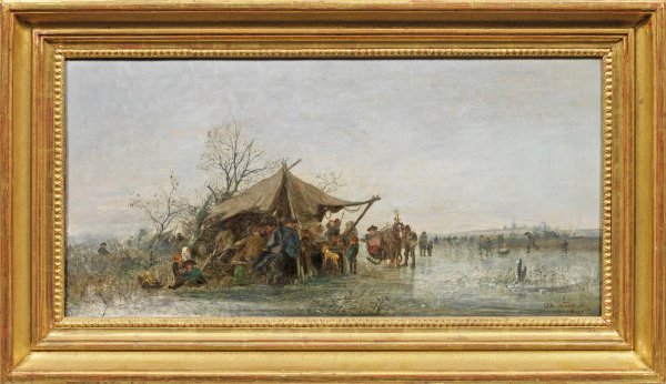 Feinflüssig gemalte, atmosphärisch gestimmte Landschaft, die durch eine Vielzahl von Menschen belebt wird, die für das freizeitliche Vergnügen auf dem Eis zusammen gekommen sind. Im Vordergrund versammeln sich zahlreiche Männer, Frauen und Kinder bei einem Zelt, in dem Speis und Trank angeboten werden. Auf der Eisfläche tummeln sich Spaziergänger, Schlittschuhläufer und Pferdeschlitten, im Hintergrund sind Bauernhäuser und eine Windmühle zu erkennen. Mit nuanciertem Duktus ausgeführte, meisterhaft in winterlichem Kolorit gemalte Landschaftsimpression des Münchner Künstlers, der an der Akademie bei Wilhelm v. Diez studierte. Öl/Lwd., doubliert; R. u. sign. und dat. 1913. 34,8 cm x 70,5 cm. Rahmen.