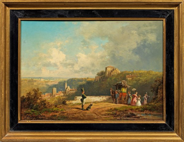 Heitere, subtil geschilderte Darstellung einer Gesellschaft beim Spaziergang auf einer Anhöhe, die bereits von einem Wachsoldaten erwartet wird. Im Hintergrund öffnet sich eine weite Landschaft mit einer erhöhten Burganlage und einem in einer sanft abfallenden Senke gelegenen, pittoresken Dorf. Charakteristisches, romantisch-biedermeierliches Sujet Moralts, das er in zahlreichen Variationen schuf und sich sehr großer Beliebheit beim zeitgenössischen Publikum erfreute. Moralt lernte bei seinem Vater Paul Moralt, einem Schüler Spitzwegs und Christian Morgensterns; überdies erbte er einige Skizzenbücher und Vorzeichnungen Spitzwegs. Ab 1903 studierte Moralt an der Münchener Akademie bei Karl Raupp und stellte schon nach kurzer Zeit erfolgreich im Münchener Glaspalast aus. Öl/Schichtholztafel. L. u. sign. und Ortsangabe M(ün)ch(e)n. 27,5 cm x 38 cm. Rahmen.