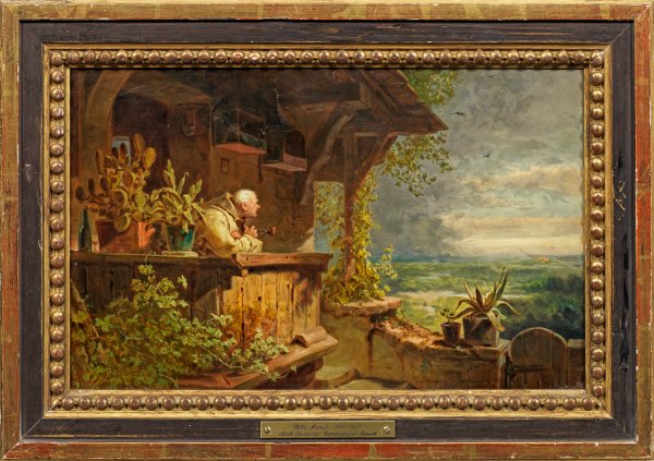 Feinflüssig gemaltes Kabinettbild nach dem bekannten Gemälde Carl Spitzwegs (um 1860). Moralt war zunächst Schüler seines Vaters Paul Moralt, einem Schüler Spitzwegs und Christian Morgensterns; überdies erbte er einige Skizzenbücher und Vorzeichnungen Spitzwegs. Neben zahlreichen Kopien, bediente sich Moralt auch reich an der heiteren, biedermeierlichen Motivwelt Spitzwegs und schuf poetisch komponierte Idyllen mit Einsiedlern, Mönchen, Mädchen, Reisegruppen und Kutschen, die sich großer Beliebtheit erfreuten. Öl/Schichtholzplatte. 24,5 cm x 40,3 cm. Rahmen.