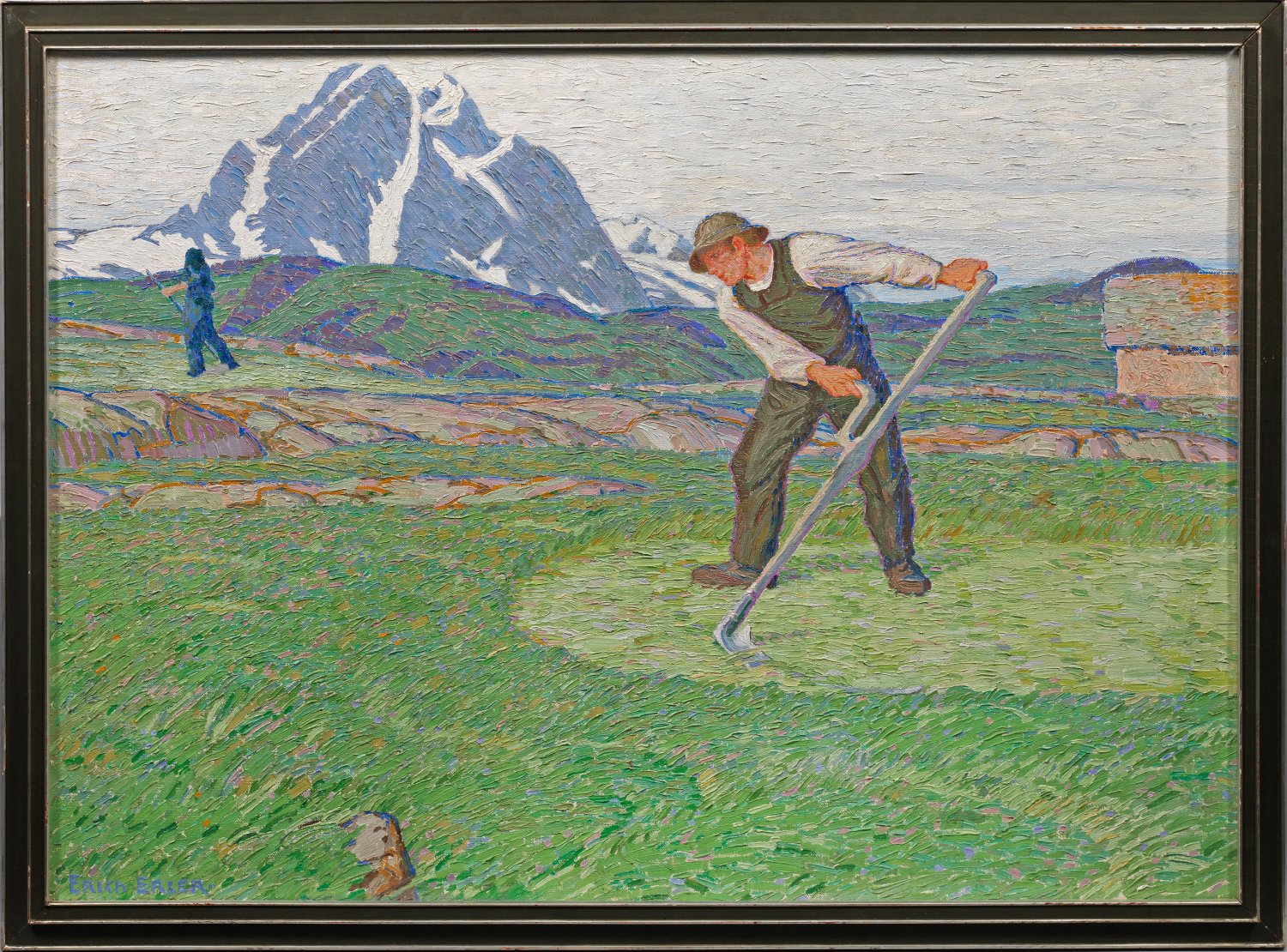 Auf dem Plateau einer Hochalm stehender Bauer, der mit einer Sense die Halme als Heu für den Winter einbringt, im Hintergrund ein schneebedeckter, steil aufragender Alpengipfel. Mit dicht verwobenem Duktus und in hellem Kolorit die Lichteffekte wiedergebendes Hauptwerk Erlers, der durch seine Schweiz-Motive aus dem Engadin bekannt wurde. 1898 weilte Erler erstmals in Samaden im Engadin, wo er seinen Malerkollegen Giovanni Segantini kennenlernte, der ihn nachhaltig prägte. Erler fand in seinen lyrischen Hochgebirgslandschaften und Darstellungen der dort lebenden, eng mit der rauen Natur verbundenen Menschen zu einem eigenen, flächig stilisierten Malstil mit klaren Formen. 1899/1900 ging Erler nach München, wurde Mitglied der Künstlergruppe "Scholle", 1901 debütierte er im Glaspalast. Rasch fand Erler Anerkennung, schon 1902 kaufte die Pinakothek ein Gemälde an. Öl/Lwd.; L. u. sign.; Verso betitelt. 100 x 141cm. Rahmen.