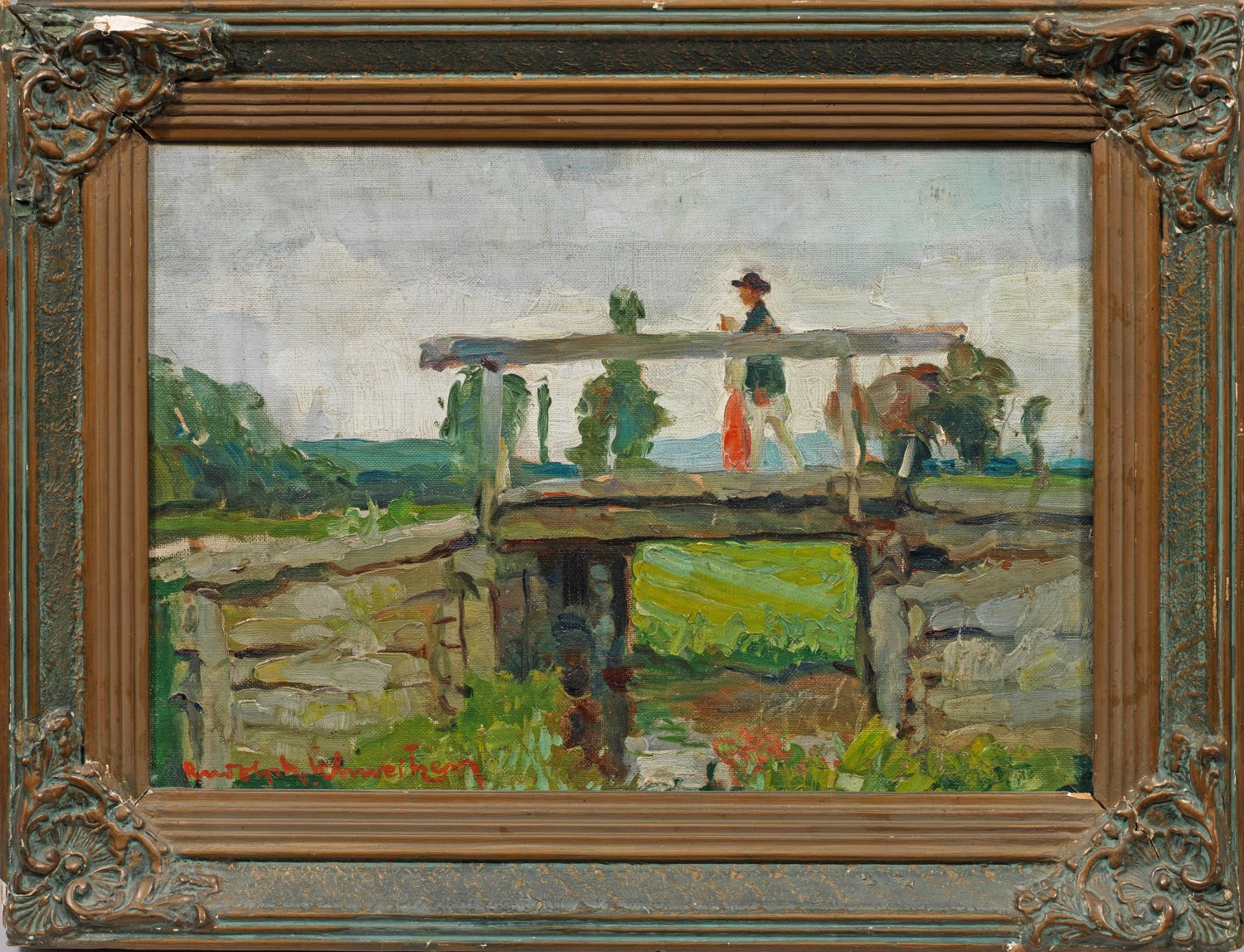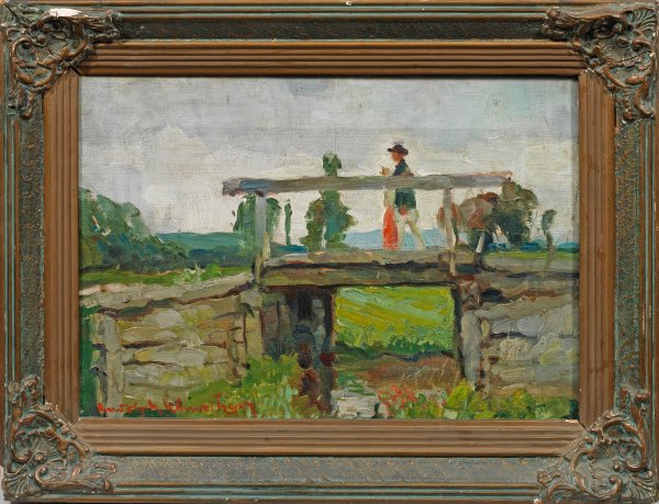 Landschaft mit einem Bauern auf einer kleinen Brücke