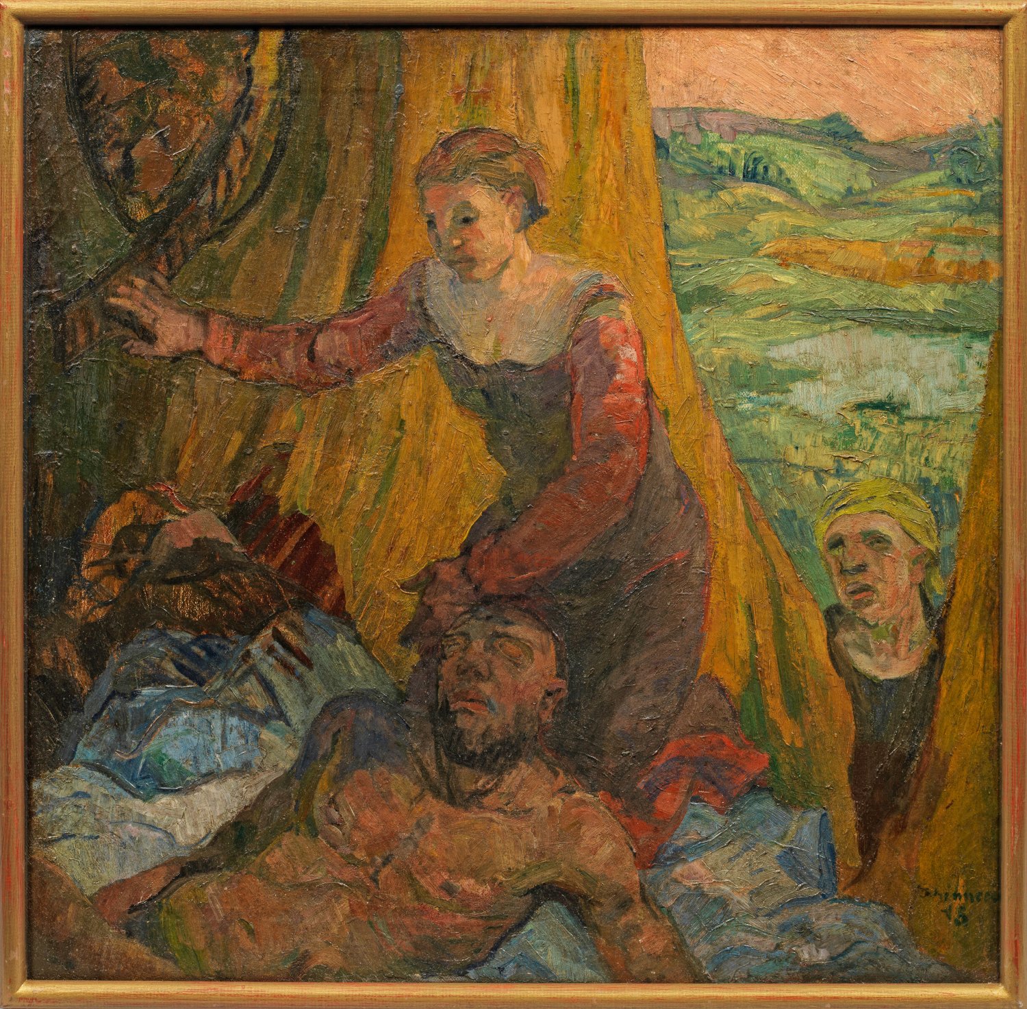 Erzählerische, mit dynamischem und pastosem Duktus angelegte Figurenszene, in der die alttestamentarische Erzählung von Samson und Delila aufgriffen wird. Der geblendete, muskulöse Samson liegt darnieder, während Delila über ihm kniet und im Hintergrund Samsons Feinde bereits hinter dem Vorhang bereitstehen. Die reduzierte, vom Impressionismus ausgehende Farbpalette ist besonders charakteristisch für den Mitbegründer der Neuen Sezession München, der an der Akademie in Karlsruhe u. a. bei Walter Conz, Ludwig Schmid-Reutte und Wilhelm Trübner ausgebildet wurde und anschließend seine Studien an der Akademie in München fortsetzte. 1909 wurde er mit dem Villa-Romana-Preis ausgezeichnet, was ihm einen einjährigen Studienaufenthalt in Italien ermöglichte. Öl/Lwd.; R. u. sign. und dat. (19)18. Verso altes Papieretikett mit Ausstellungs-/Inv.-Nr. 1627. 68,5 cm x 71 cm. Atelierleisten.