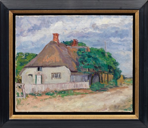 Spätimpressionistische, pastelltonig gemalte Darstellung eines Bauern- oder Fischerhauses in der Küstenregion aus einer Werkreihe norddeutscher Landschaften. Kothers Oeuvre wurde stark durch die "Brücke"-Maler Max Pechstein, Erich Heckel und Ernst Ludwig Kirchner sowie seinem Freund und Schwager Otto Mueller beeinflusst. 1912/13 hatte Kother erste erfolgreiche Einzel- und Gemeinschaftsausstellungen mit Pechstein und Beckmann. 1914 ging Kother von Dresden in die Kunstmetropole Berlin, wo ihn Herwarth Walden 1916 zusammen mit Pechstein und Lyonel Feininger in seiner "Sturm"-Galerie zeigte. 1921 widmete ihm die Galerie Moeller eine von Max Osborn gerühmte Einzelausstellung; 1922 erhielt Kother durch Max Liebermann den Ehrenpreis der Preußischen Akademie der Künste. In der Zeit des Nationalsozialismus gehörte auch Kother zu den verfemten modernen Künstlern. Öl/Lwd.; 50 cm x 61,5 cm. Verso Etikett mit Nachlass-Stempel u. Wvz.-Nr. Ö 131. Rahmen.
