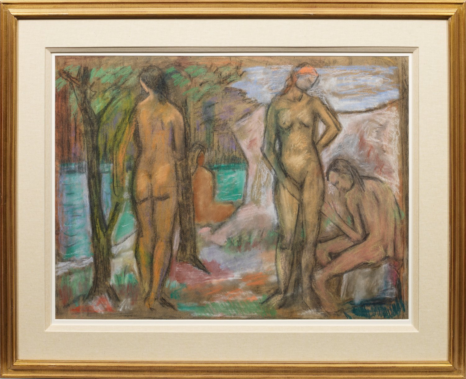 Kaum deutlicher als in solchen expressionistischen Darstellungen mit badenden Frauenakten sichtbar, wird der Einfluss von Paul Cézanne, den "Brücke"-Malern Max Pechstein, Erich Heckel und Ernst Ludwig Kirchner sowie seinem Freund und Schwager Otto Mueller. 1912/13 hatte Kother erste erfolgreiche Einzel- und Gemeinschaftsausstellungen mit Pechstein und Beckmann. 1914 ging Kother von Dresden in die Kunstmetropole Berlin, wo ihn Herwarth Walden 1916 zusammen mit Pechstein und Lyonel Feininger in seiner "Sturm"-Galerie zeigte. 1921 widmete ihm die Galerie Moeller eine Einzelausstellung. In der Zeit des Nationalsozialismus gehörte auch Kother zu den verfemten modernen Künstlern. Pastell/Papier. Verso Etikett mit Nachlass-Stempel u. Wvz-Nr. P 47. 62,5 cm x 85 cm (Passepartoutausschnitt). Rahmen.