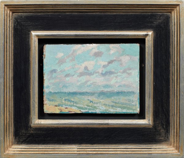 Kleinformatiges, stiltypisches, wohl in Freilichtmalerei vor Ort entstandenes Werk der Impressionistin, die vornehmlich Landschaften malte. Köhler-Roeber besuchte 1906-1914 die fortschrittliche Malschule von Johannes Walter-Kurau in Dresden und lernte an der bekannten Debschitz-Schule in München. Öl/Papier, auf dicken Karton oder eine Platte kaschiert. Ca. 13,2 cm x 18 cm. Rahmen.