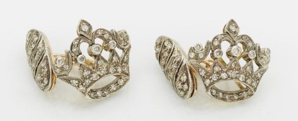 Gelbgold, teilw. mit Silber verbödet und farbig emailliert, gest. 583. Schauknöpfe in Form von Adels-Kronen, ausgefasst mit kleinen Diamanten; Ges.-Gew. ca. 6,32 g.