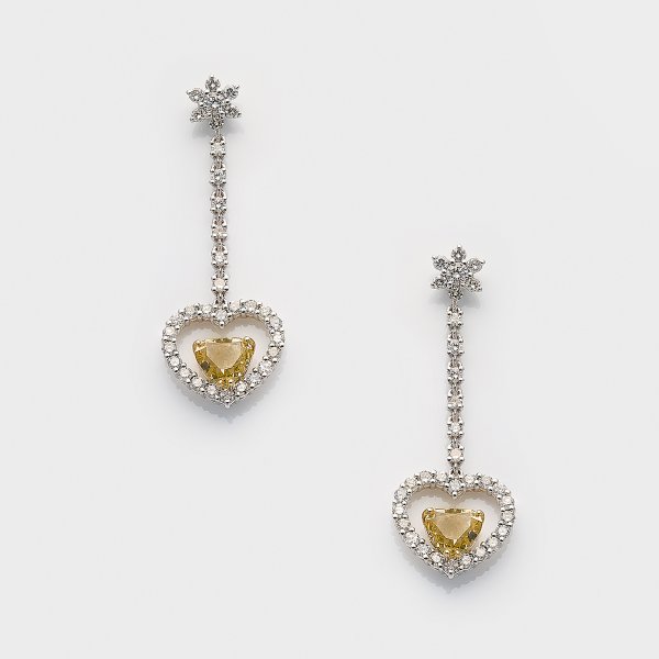 Weißgold, gest. 750. Schauseitig besetzt mit 2 Fancy Deep Brownish Yellow-Diamanten von jeweils ca. 1,01 ct. im Herzschliff, ausgefasst mit kleinen Brillanten von zus. ca. 1,13 ct.; Ges.-Gew. ca. 4,90 g.