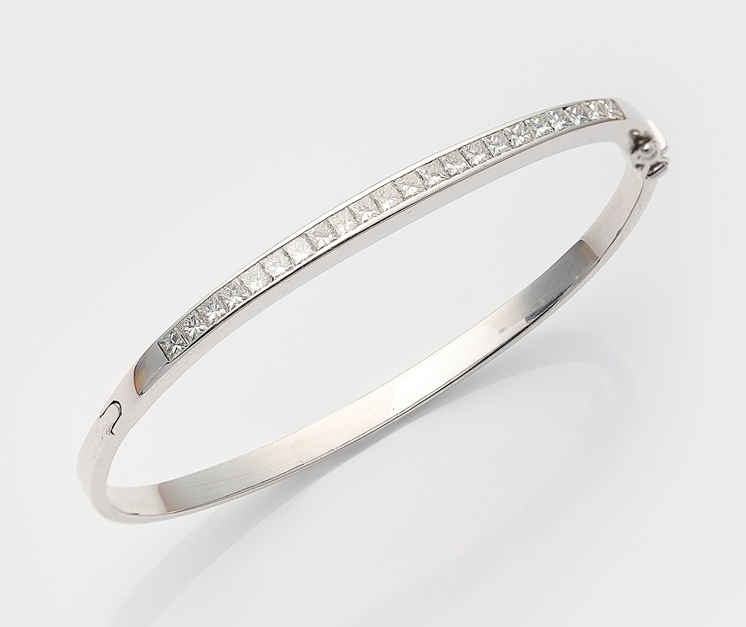 Weißgold, gest. 750. Linear besetzt mit Diamanten von zus. ca. 2,50 ct. (G-H/vs) im Princesscut. Gew. ca. 18,54 g.