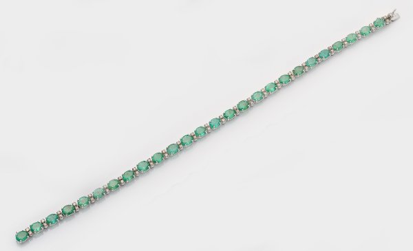 Bracelet set with emeralds approx. 8,00 ct. and small diamonds approx. 0,60 ct., in 14 k white gold. Leather case.
