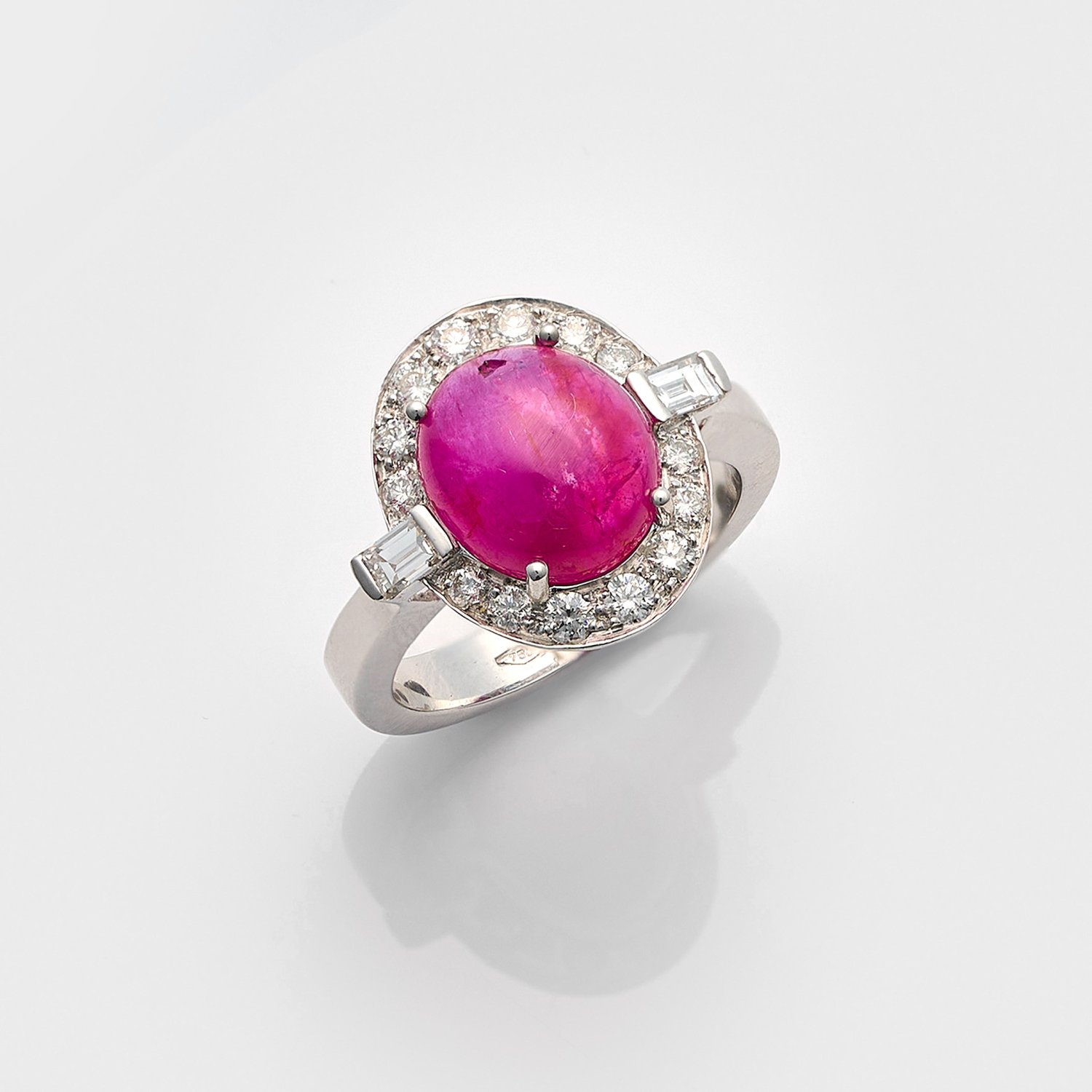 Weißgold, gest. 750. Zentral besetzt mit himbeerfarbenem Rubin-Cabochon von ca. 5,59 ct., entouriert von Brillanten und Diamanten von zus. ca. 0,90 ct.; Gew. ca. 8,56 g.