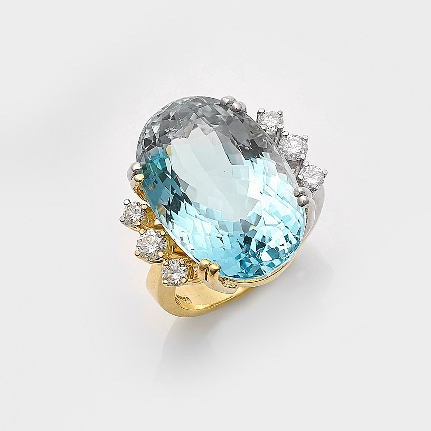 Ring set with a vivid blue aquamarine approx. 18,43 ct. and brilliants approx. 0,52 ct. (F-G/vvs), in 18 k gold. Certificate included.
