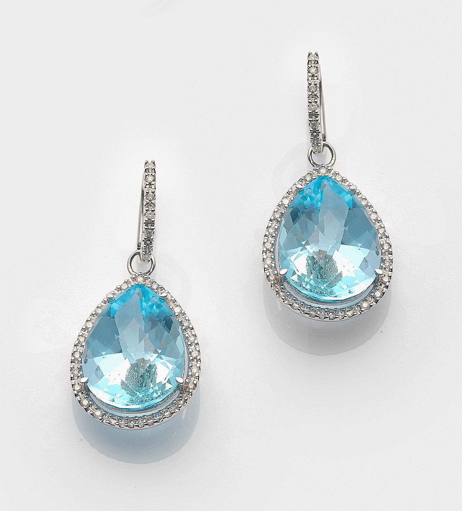 Pair of earrings set with turquoise aquamarines approx. 18 mm x 13 mm, diamonds approx. 0,60 ct. (G/si), in 18 k white gold.