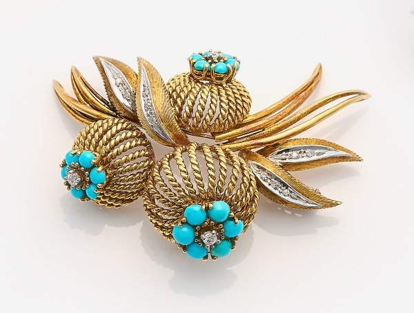 Lot 999: Blütenbrosche mit Türkisen und Diamanten
