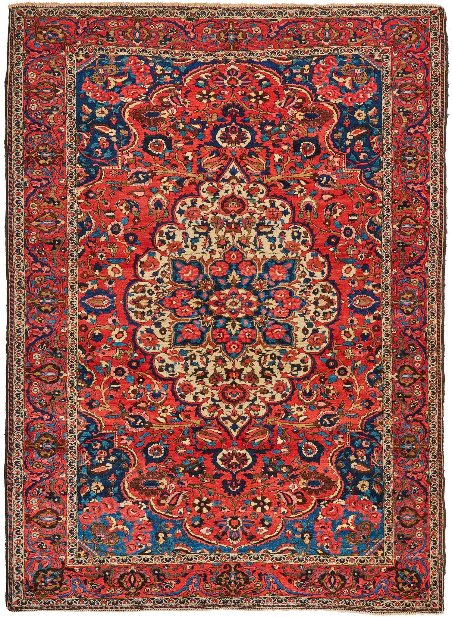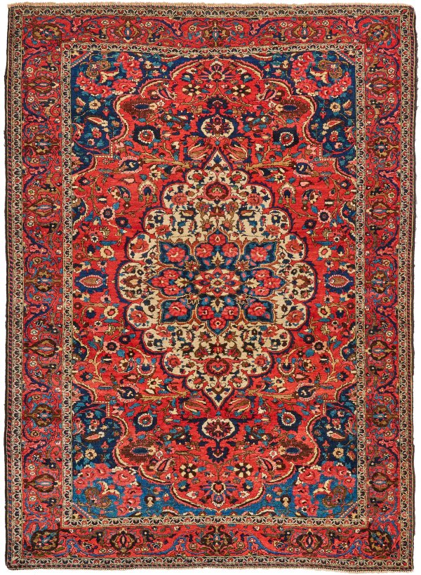 Persien. Um 1920. Wolle auf Baumwolle. Im roten Innenfeld große, elfenbeinfarbene Bordüre mit blauem, kartuschenförmigen Zentralmedaillon sowie breite Ecklösungen. Flächendeckend dichte Blütenmusterung. Umlaufend korrespondierende, rote Bordüre aus Palmettenranken. 147 cm x 254 cm.