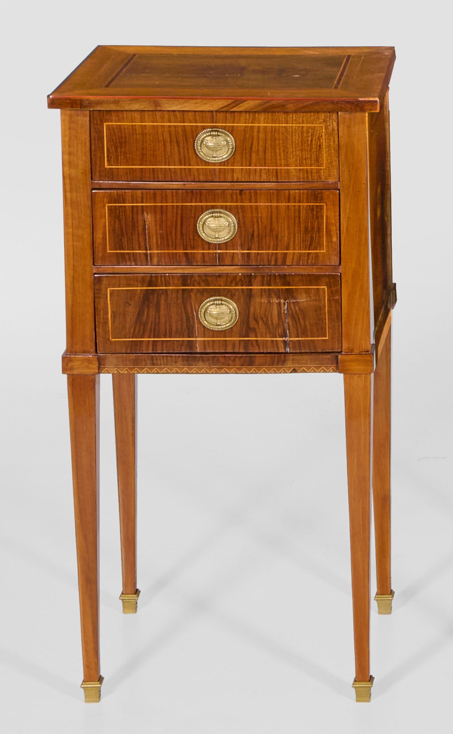 Nussbaum, massiv und furniert. Gerader, rechteckiger Korpus auf hohen, konischen Vierkantbeinen. In der gegliederten Front drei Schubladen. Gering überstehende Deckplatte. Allseitig flächendeckende Furnierfelder, von Bandeinlagen begrenzt. Rest. mit Erg.; H. 78 cm. 40 cm x 34 cm.