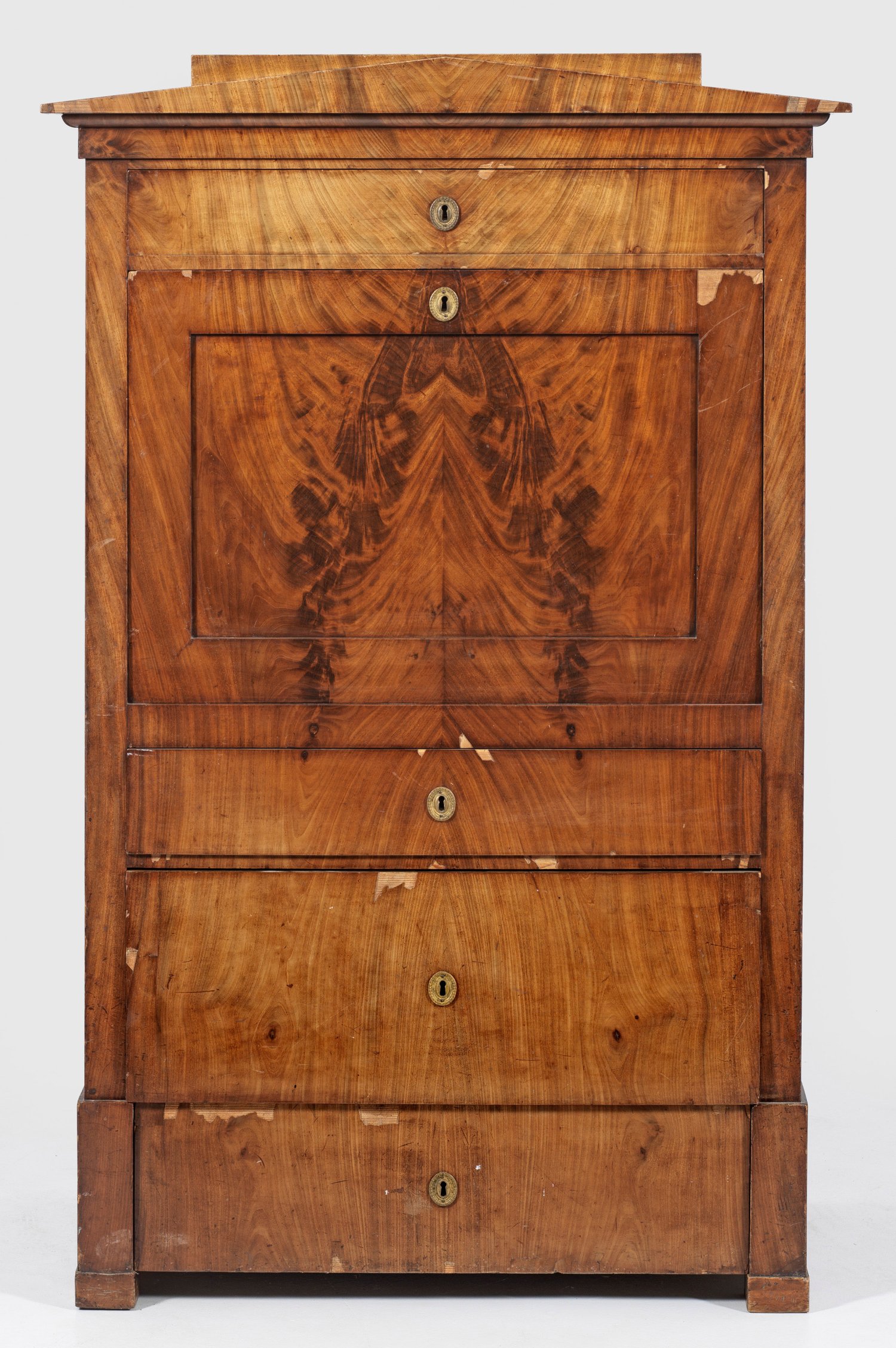 Mahagoni, furniert. Gerader, hochrechteckiger Korpus auf gekanteten Füßen. In der gegliederten Front vier Schubladen sowie abklappbare Arbeitsfläche. Dahinter Facheinteilung. Gestuft ansteigender oberer Abschluss. Restaurierungsbedürftig. H. 155 cm. 99 cm x 51 cm.