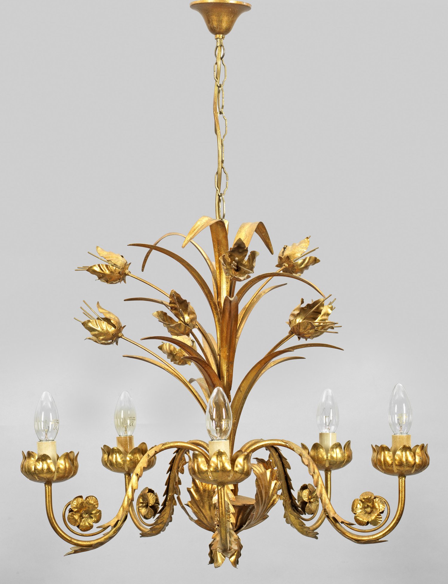 5-flg.; Metall, vergoldet. Schlanker Schaft umgeben von stilisierten Blüten und gestreckten Blättern. Unterhalb davon ausgehend stark geschwungene Leuchterarme mit blütenförmigen Trägern für Leuchtmittel. Elektrifiziert. Kettenaufhängung. Ges.-H. 85 cm. D. 56 cm.