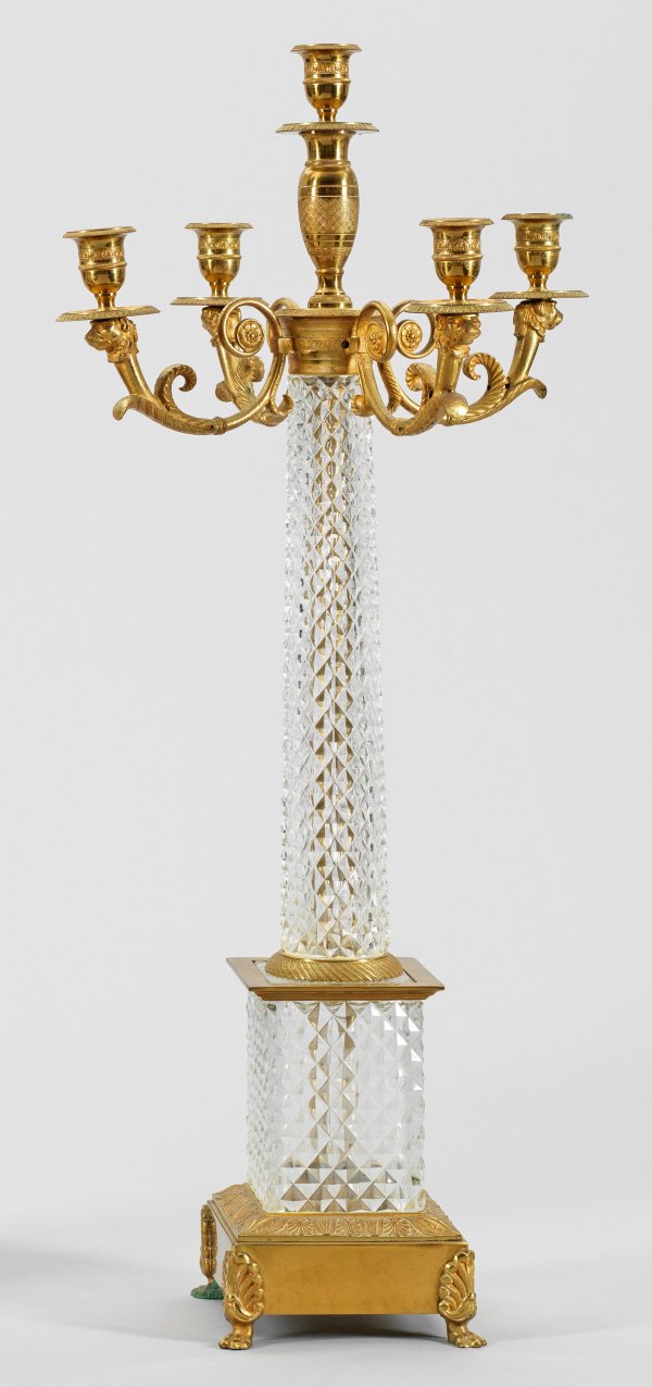 5-flg.; Bronze, vergoldet und farbloses Kristallglas mit flächendeckendem Steinschliff. Über quadratischem Sockel mit Tatzenfüßen hoher Podestsockel. Oberhalb konischer Säulenschaft mit reliefierter Basis als Träger für stark geschwungene Leuchterarme aus eingerollten Voluten und Löwenköpfen sowie vasenförmige Tüllen. Bohrung für Elektrifizierung. H. 72 cm.