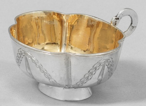 Silber. Über ovalem, konischem Stand eine vierpassige, tiefe Kuppa mit glatter Wandung und schmalem Rand. Die Wandung mit gravierten, zarten Blattfestons verziert. Seitlicher, S-förmiger Henkel. Innen vergoldet. Gest., Beschauzeichen, zweifache, bisher unbekannte Meistermarke "M.N". Gew. ca. 40 g. H. 3,5 cm.