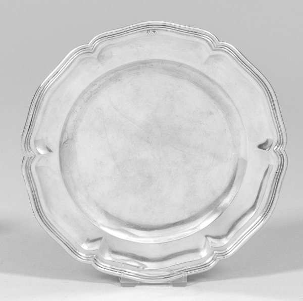 Silber. Rund, in klassischer Chippendaleform. Gering vertiefter, glatter Spiegel, übergehend in breite Fahne. Blütenförmig geschweifter, mehrfach profilierter Rand. Minim. besch.; Gest., Beschauzeichen, unbekanntes Meisterzeichen "HH". Gew. ca. 250 g. D. 22 cm.
