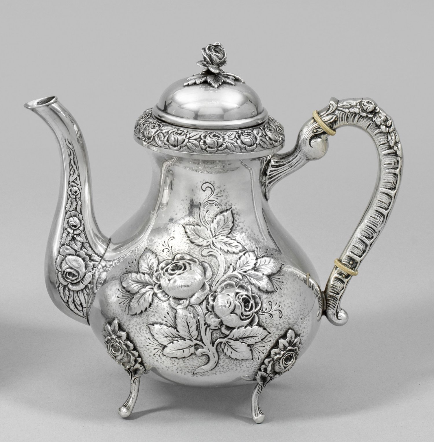 Sterlingsilber. Über vier schmalen Füßen ein stark gebauchter, glatter Korpus mit schlankem Hals, tief angesetztem Röhrenausguss und Ohrenhenkel. Aufgewölbter Scharnierdeckel. Großflächiger, reliefplastischer Blütendekor sowie Knauf in Form einer vollplastischen Rose. Rest.; Gest. 925, Herstellerzeichen "AS". Gew. ca. 890 g. H. 22,5 cm.