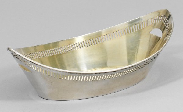 Silber. Über flachem Ovalstand schiffchenförmiger Korpus. Die Seiten spitz aufsteigend mit halbmondförmigen Aussparungen als Handhaben. Gering ausgestellter Rand umzogen von reliefiertem Perlband über durchbrochen gearbeitetem Stabfries. Innen vergoldet. Gest. 800, Herstellerzeichen, Händlermarke der Firma Hessenberg aus Frankfurt am Main. Gew. ca. 465 g. H. 9 cm. 29 cm x 16,5 cm.