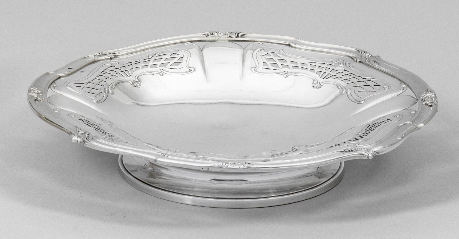 Silber. Runder, flacher Stand, übergehend in weit ausschwingende, gering gemuldete Schale. Der Randbereich umzogen von reliefiertem Akanthusblatt und Rocaillendekor sowie vierfach in länglichen Kartuschen durchbrochen gearbeitet. Gest., Feingehaltsstempel 1838-1973. Gew. ca. 515 g. H. 4,5 cm. D. 24 cm.