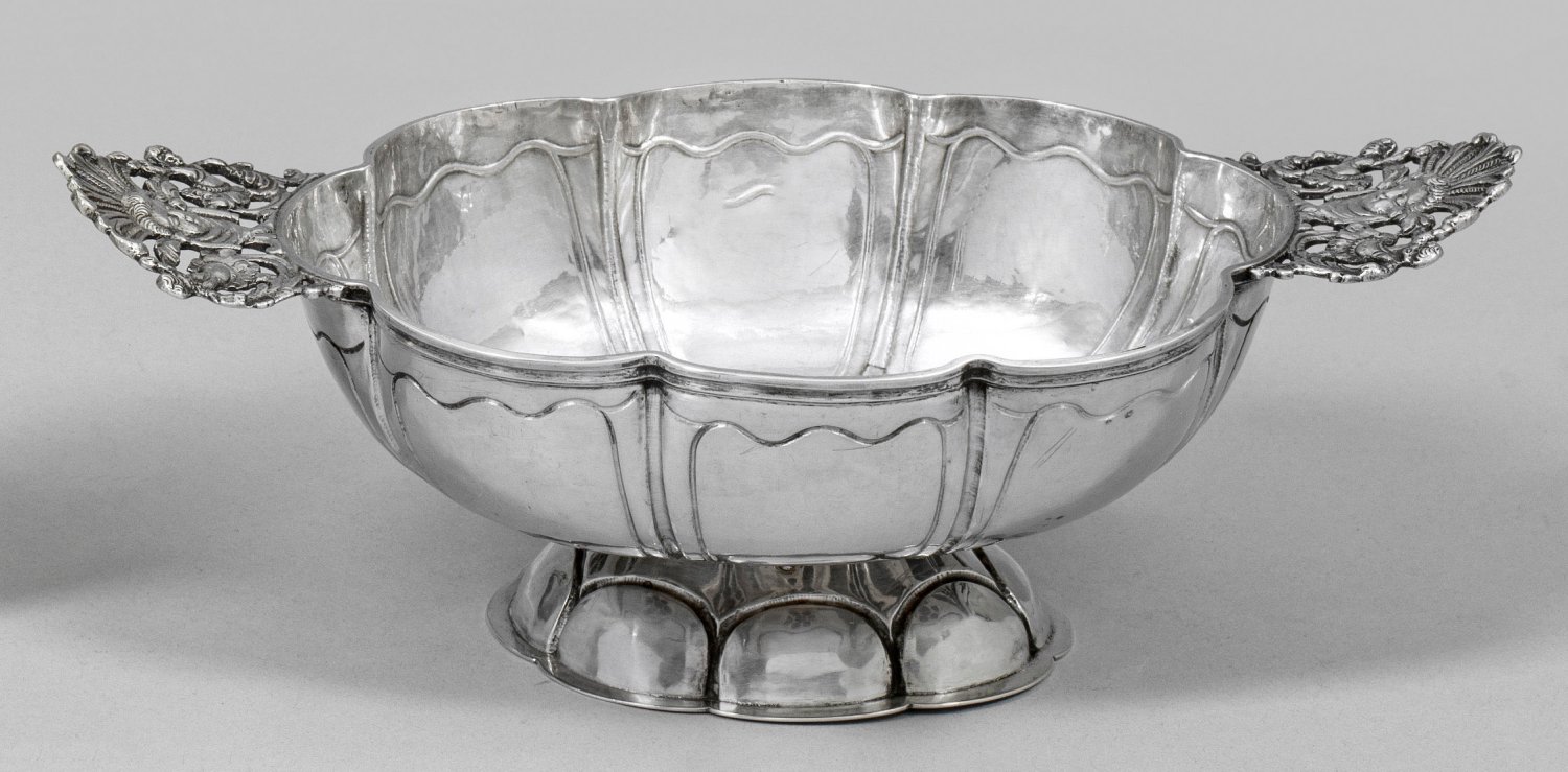 Silber. Ovaler, aufgewölbter Fuß, übergehend in kurzen Schaft und schiffchenförmige, passig geschweifte Schale. Fuß und Schale umzogen von kartuschenähnlichem Dekor. Im Schaleninneren reliefierter, punzierter Blütendekor. Durchbrochen gearbeitete, waagerechte Handhaben mit Maskaronen. Gest., Beschauzeichen, Meister wohl Jacobus van Steeden (tätig nach 1850), Jahresbuchstabe "Y". Gew. ca. 230 g. H. 8,5 cm. 24,5 cm x 13,5 cm.