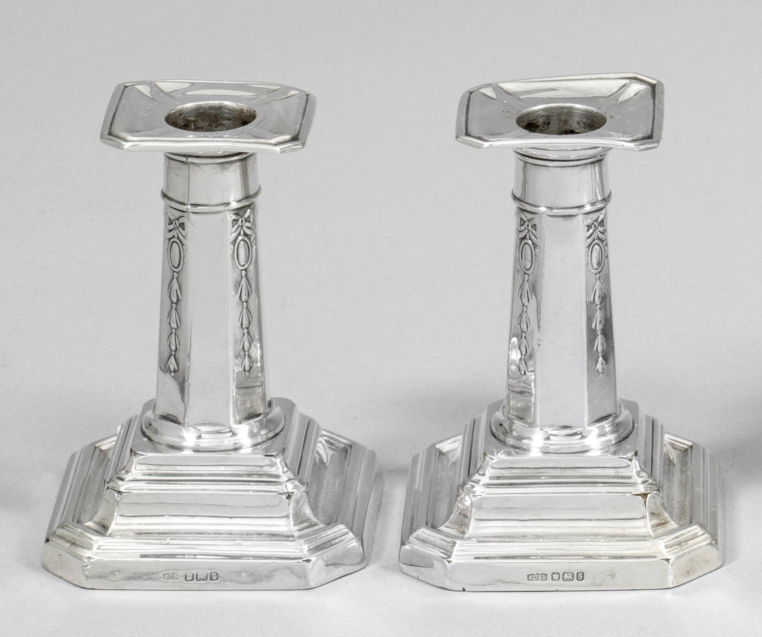 Sterlingsilber. Quadratischer, getreppt ansteigender Stand mit gekanteten Ecken, beschwert. Sich gering verjüngender, facettierter Schaft, übergehend in Tülle mit breiter Traufschale. Schaft verziert mit Medaillon-, Schleifen- und Blütenkelchdekor. Besch.; Gest., Beschauzeichen, Herstellerzeichen, Jahresbuchstabe "S". Gew. zus. ca. 400 g. H. 10 cm.