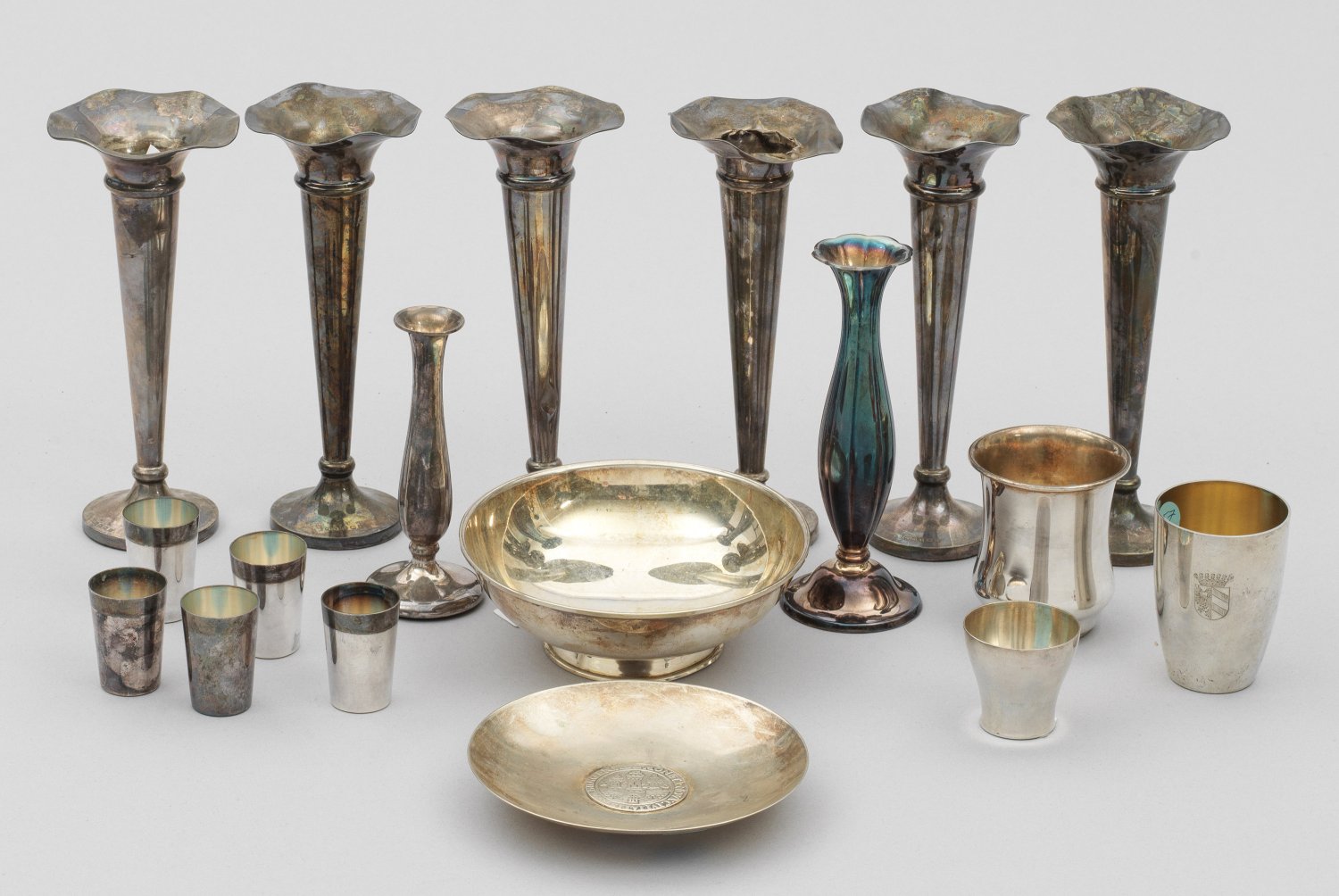 Silber, teilw. beschwert. 18-tlg.; Acht trompetenförmige Vasen, sechs Schnapsbecher, zwei Becher und zwei Schalen. Teilw. besch. und graviert. Gest. 830, 835, 925, verschiedene Herstellerzeichen u. a. Arthur Möhrle, Jacob Grimminger, Wilhelm Binder (Schwäbisch Gmünd) sowie Ellis & Co (Birmingham). Gew. zus. ca. 1245 g. H. 4,5 cm -19 cm. Schalen-D. 12,5 cm - 13,5 cm.