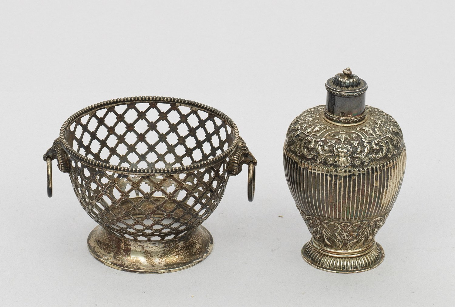 A small silver basket and a tea caddy. Partly assay mark and maker´s mark. Glass insert missing.