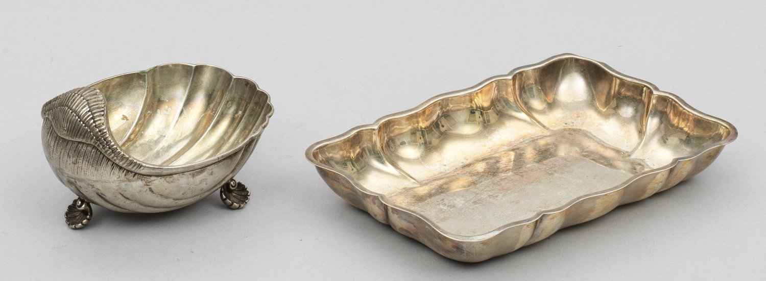 Silber. Rechteckig sowie muschelförmig. Teilw. monogr.; Gest. 800, 830, verschiedene Herstellerzeichen. Gew. zus. ca. 425 g. H. 3 cm - 8,5 cm. B. 14 cm - 22 cm.