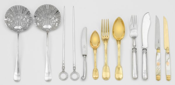 A mixed 53-piece parcel-gilt silver cutlery. Partly monogrammed, stainless steel blades or mother of pearl handles. Partly standard mark 800, 900, different assay, maker´s marks, date letter. 28 plated and silver cutlery items added.