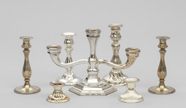 Silber, beschwert. 7-tlg.; Sechs Tafelleuchter unterschiedlicher Größe und eine 3-flg. Girandole. Teilw. besch.; Gest. 835, 925, verschiedene Herstellerzeichen u. a. Wilkens & Söhne (Bremen), Arthur Möhrle sowie Gebrüder Kühn (Schwäbisch Gmünd). Gew. zus. ca. 2625 g. H. 4,5 cm -18,3 cm.