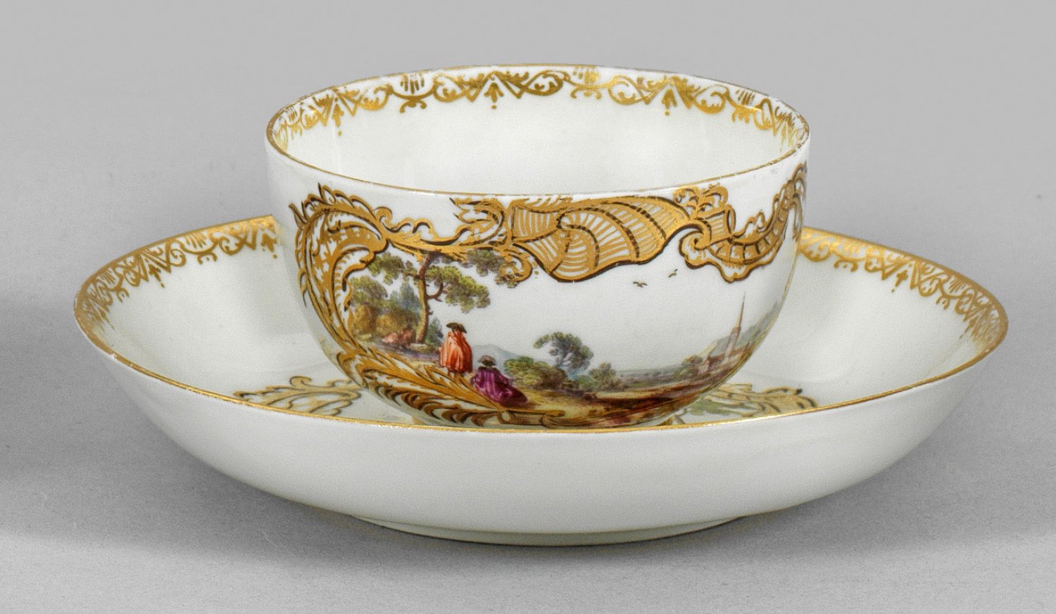 A porcelain cup and saucer painted with landscapes. Crossed swords mark.