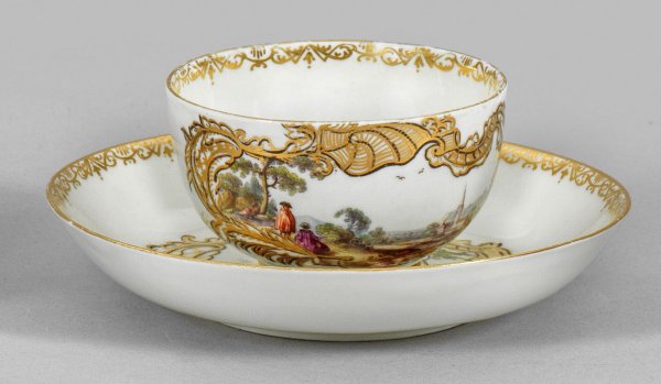 Halbkugelförmig. Schauseitig und im Spiegel, in goldener Rocaillekartusche gerahmte, architekturbestandene Uferlandschaft mit Figurenstaffage in polychromer Malerei. Sammlungsetikett. Purpur-Nr. 69. Schwertermarke. H. 4,5 cm.