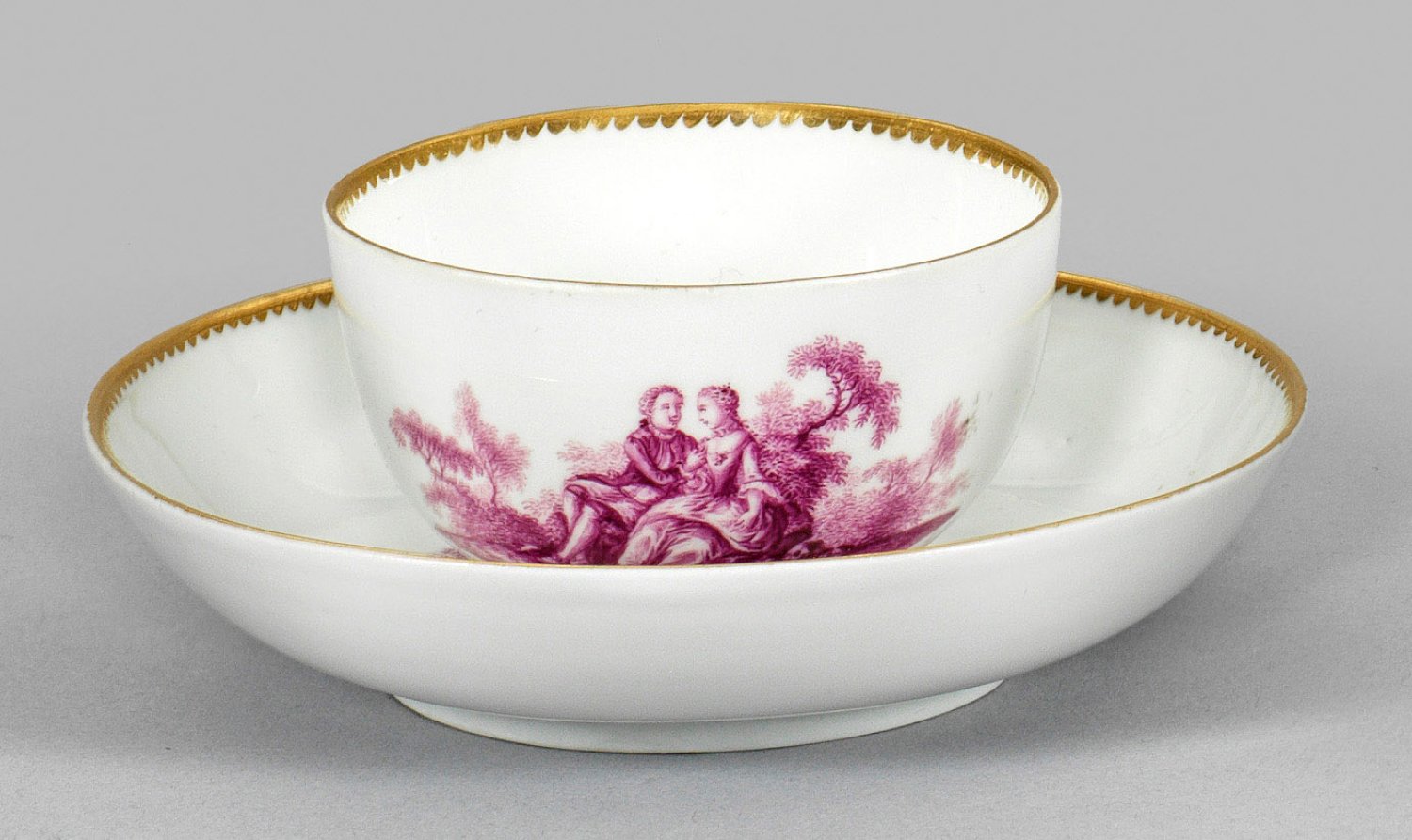 auf Untertasse. Auf Wandung und Spiegel Watteauszenen mit galanten Paaren in Parklandschaft. Teilw. Blumendekor. Purpurfarbene Camaieumalerei. Goldrand als Zahnkante. Schwertermarke. H. 5 cm.