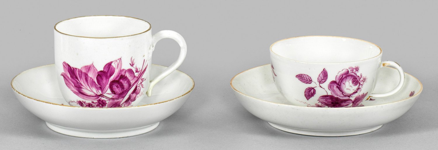 auf Untertassen. Auf der Wandung und im Spiegel Blumengebinde und vereinzelte Blütenzweige in purpurfarbener Camaieumalerei. Teilw. mit Goldrand. U.a. Marcolini-Zeit. Ber.; Schwertermarke. H. 4,5 cm - 6,5 cm.