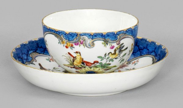 auf Untertasse. Auf der Schauseite und im Spiegel unterglasurblauer Schuppenmosaikfond. Darin ausgesparte, farbige Rocaillereserven mit unterschiedlichen, farbenprächtigen Darstellungen heimischer Wald- und Singvögel in polychromer Malerei. Goldstaffage. Schwertermarke. H. 4,5 cm.
