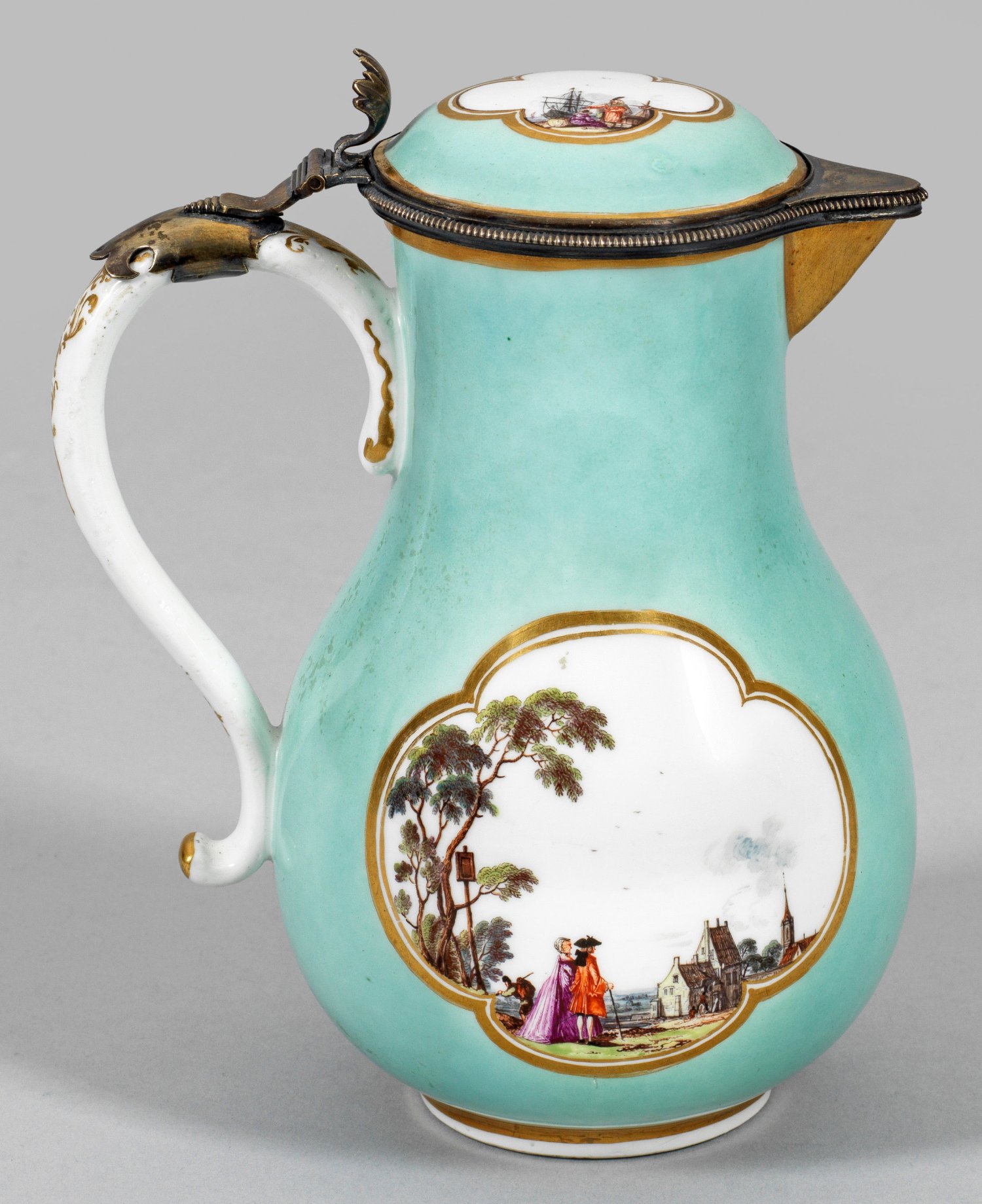 Auf kurzem Standring birnförmiger Korpus mit ornamentiertem Bandhenkel sowie vergoldetem Schnabelausguss. Flach gewölbter Scharnierdeckel. Beidseitig der Wandung und auf dem Deckel, in türkisfarbenem Fond ausgesparte, goldkonturierte Vierpassreserven mit verschiedenen, figurenreichen Landschaftsszenen. Schauseitig, vor dörflicher Kulisse ein Edelmann zu Pferd, um Wegauskunft bittend bzw. ein höfisches Watteaupaar auf ein Gehöft blickend. Auf dem Deckel Kauffahrteiszene mit orientalischen Kaufleuten unweit eines Segelschiffes. Feine, polychrome Malerei mit Golddekor. Silbermontierung mit Restvergoldung. Undeutl. gest.; Schwertermarke. H. 18,5 cm.