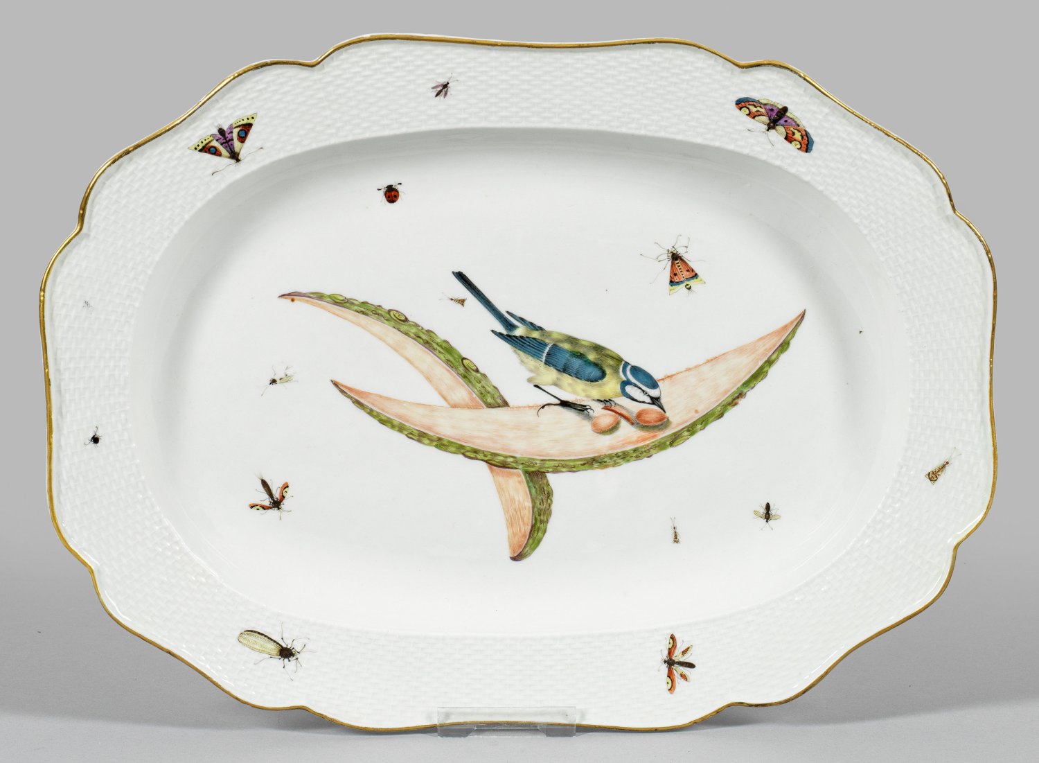 Ovale Form mit passigem Rand. Reliefdekor "Altozier". Im vertieften Spiegel Motiv einer Blaumeise, auf Fruchtschale sitzend. Umgebende Schmetterlinge, Käfer und sonstigen Insekten. Polychrome Malerei. Goldrand. Schwertermarke. 37 cm x 27,5 cm.